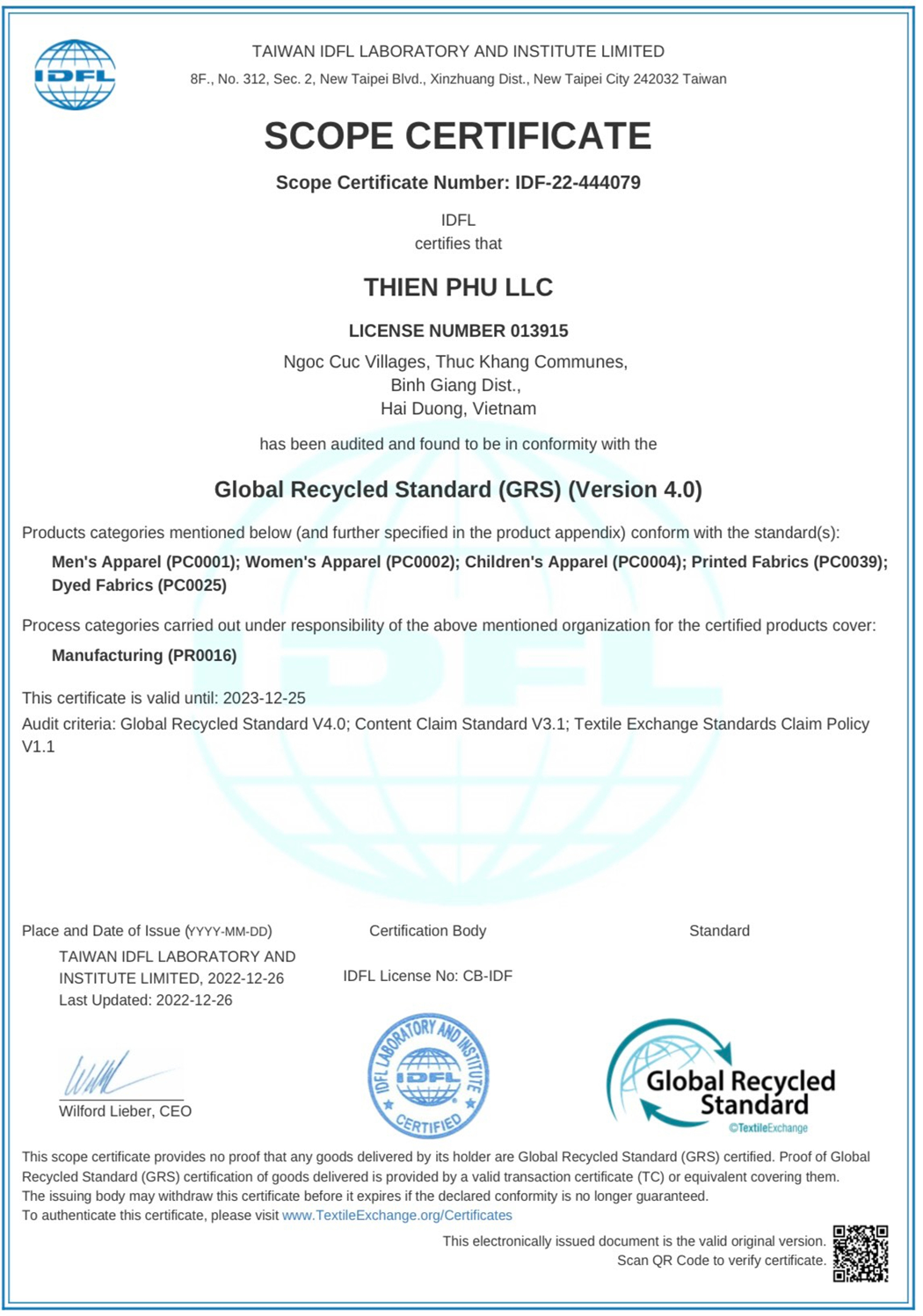 QUALITY MANAGEMENT AND CONTROL TO GRS GLOBAL RECYCLE STANDARD